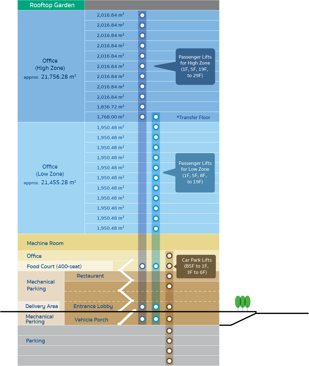 Forest space located by the tower entrance and rooftop, over 1,000 square meters in size